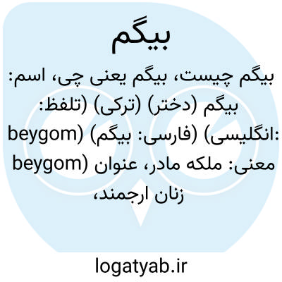 معنی: ملکه مادر، عنوان زنان ارجمند، خانم، خاتون، به صورت پسوند همراه با بعضی نامها می آید و نام جدید می سازد مانند فاطمه بیگم، عنوان زنام منسوب به خانواده های سلطنتی و بزرگان