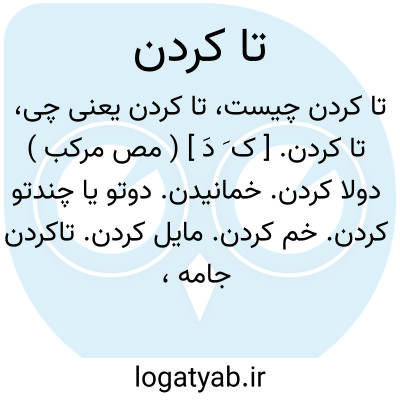 تا کردن. [ ک َ دَ ] ( مص مرکب ) دولا کردن. خمانیدن. دوتو یا چندتو کردن. خم کردن. مایل کردن. تاکردن جامه، قالی، لحاف و جز آن؛ به چندلا کردن آن: جامه ها را تا کرد. از بسیاری ورم، زانوها رانمیتوانم تا کرد. رجوع به «تا» شود. || رفتار. سلوک. معامله: خوب تا کردن با کسی یا بد تا کردن با کسی؛ با او حسن معامله یا سوء معامله داشتن.