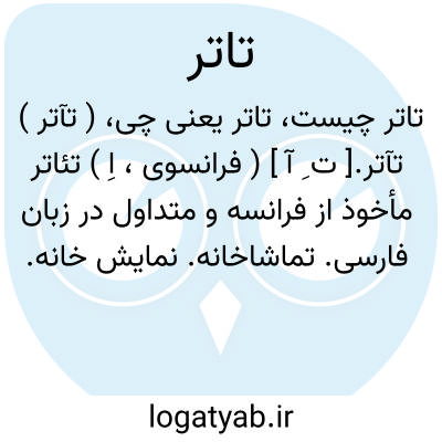 ( تآتر ) تآتر.[ ت ِ آ ] ( فرانسوی، اِ ) تئاتر مأخوذ از فرانسه و متداول در زبان فارسی. تماشاخانه. نمایش خانه. بازیگرخانه. صحنه یا جایی که بازیگران برای نشان دادن داستان یا واقعه ای ظاهر شوند و آنرا مجسم سازند. فرهنگستان ایران بجای این کلمه «تماشاخانه » را پذیرفته است. رجوع به تماشاخانه شود.