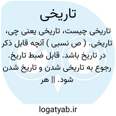( صفت )۱-منسوب به تاریخ:جنب. تاریخی داستان تاریخی. ۲ - قابل درج در تاریخ: (( این واقعه تاریخی است. ) )