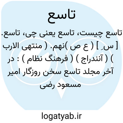 تاسع. [ س ِ ] ( ع ص )نهم. ( منتهی الارب ) ( آنندراج ) ( فرهنگ نظام ): در آخر مجلد تاسع سخن روزگار امیر مسعود رضی اﷲعنه بدان جایگاه رسانیدم که وی عزیمت درست کرد، رفتن بسوی هندوستان [ را ] و تا چهار روز بخواست رفت و مجلدبر آن ختم کردم. ( تاریخ بیهقی چ ادیب ص 662 و چ فیاض ص 664 ). || نُه گرداننده. ( منتهی الارب ).