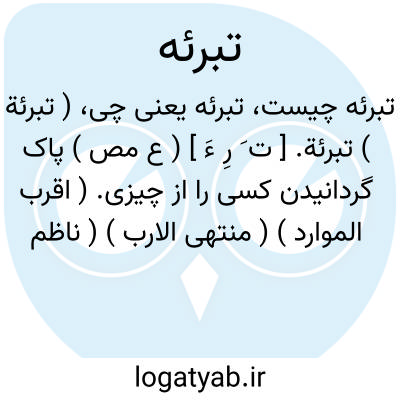 ( تبرئة ) تبرئة. [ ت َ رِ ءَ ] ( ع مص ) پاک گردانیدن کسی را از چیزی. ( اقرب الموارد ) ( منتهی الارب ) ( ناظم الاطباء ). رفع شبهه کردن از کسی و درست داشتن برائت او. || بیزار کردن کسی را از چیزی. ( اقرب الموارد ). بیزار کردن. ( دهار ) ( ترجمان علامه جرجانی ). بیزار ساختن از چیزی. ( از منتهی الارب ) ( ناظم الاطباء ).