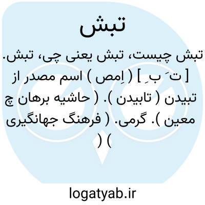 تبش. [ ت َ ب ِ ] ( اِمص ) اسم مصدر از تبیدن ( تابیدن ). ( حاشیه برهان چ معین ). گرمی. ( فرهنگ جهانگیری ) ( فرهنگ رشیدی ) ( فرهنگ اوبهی ) ( فرهنگ خطی کتابخانه سازمان ) ( شرفنامه منیری ) ( از فرهنگ نظام ). گرما و گرمی را گویند. ( برهان ) ( انجمن آرا ) ( آنندراج ) ( ناظم الاطباء ): گرداگرد ایشان دیواری بکشیدند بلند تا سالیان برآمد که تبش و سرما ایشان را دریافت. ( ترجمه طبری بلعمی ).