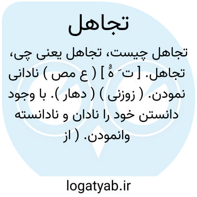 تجاهل. [ ت َ هَُ ] ( ع مص ) نادانی نمودن. ( زوزنی ) ( دهار ). با وجود دانستن خود را نادان و نادانسته وانمودن. ( از اقرب الموارد ) ( از قطر المحیط ) ( غیاث اللغات ) ( آنندراج ). خویشتن را نادان نمودن. ( منتهی الارب ) ( ناظم الاطباء ). خود را نادان در امری نشان دادن. ( فرهنگ نظام ). || نادانی رابهانه کردن و ساده دلی را وانمودن. ( ناظم الاطباء ).