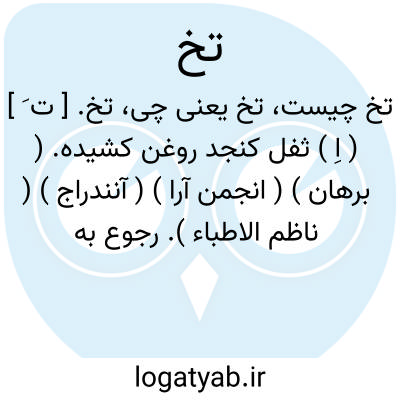 تخ. [ ت َخ خ ] ( ع اِ ) عصاره کنجد. رجوع به تَخ شود. || خمیر ترش. ( منتهی الارب ) ( آنندراج ) ( ناظم الاطباء ) ( اقرب الموارد ) ( قطر المحیط ). || دُزی در ذیل قوامیس عرب، معنی این کلمه را بزبان بربر، پوسیدن چوب و غیره آورده است. رجوع به دزی ج 1 ص 142 شود.