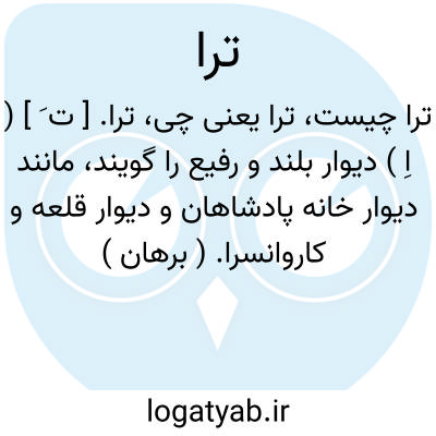 ترا. [ ت َ ] ( اِ ) دیوار بلند و رفیع را گویند، مانند دیوار خانه پادشاهان و دیوار قلعه و کاروانسرا. ( برهان ) ( از ناظم الاطباء ). دیوار بس رفیع و بلند را گویند مانند دیوار خانه پادشاهان و دیوار کاروانسرا و حصار قلعه و امثال آن. ( فرهنگ جهانگیری ). دیواری بزرگ و سخت باشدکه بسیار بلند و عظیم بود و در پیش چیزی یا کسی بکشند. ( لغت فرس اسدی چ اقبال ص 14 ). دیوار بلند مانند دیوار خانه پادشاهان و کاروانسرا و قلعه، و تری به اماله نیز آمده. ( فرهنگ رشیدی ) ( از انجمن آرا ) ( از آنندراج ). دیواری بود یگانه سخت عظیم و بلند که پیش کسی یا چیزی کشند. ( اوبهی ). سدی و دیواری را گفته اند که در پیش چیزی بکشند، و دیواری که با کاهگل و گلابه استوار کرده باشند. ( از برهان ). دیواری بکاه سخت کرده،با گلابه استوارکرده. ( شرفنامه منیری ):