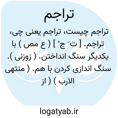 تراجم. [ ت َ ج ُ ] ( ع مص ) با یکدیگر سنگ انداختن. ( زوزنی ). سنگ اندازی کردن با هم. ( منتهی الارب ) ( از آنندراج ) ( اقرب الموارد ) ( المنجد ): تراجموا بالحجاره؛ سنگ اندازی کردند با هم. ( منتهی الارب ) ( ناظم الاطباء ).