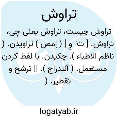 تراوش. [ ت َ وِ ] ( اِمص ) تراویدن. ( ناظم الاطباء ). چکیدن. با لفظ کردن مستعمل. ( آنندراج ). || ترشح و تقطیر. ( ناظم الاطباء ). رجوع به تراوش کردن و تراوش نمودن شود.