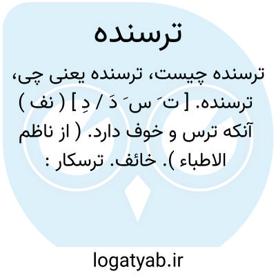 ترسنده. [ ت َ س َ دَ / دِ ] ( نف ) آنکه ترس و خوف دارد. ( از ناظم الاطباء ). خائف. ترسکار: گفتند چونست که ما هیچ ترسنده نمی بینیم، گفت اگر شما ترسنده بودی... ( تذکرةالاولیاء عطار ). || جبان و کم جرئت. ( ناظم الاطباء ):