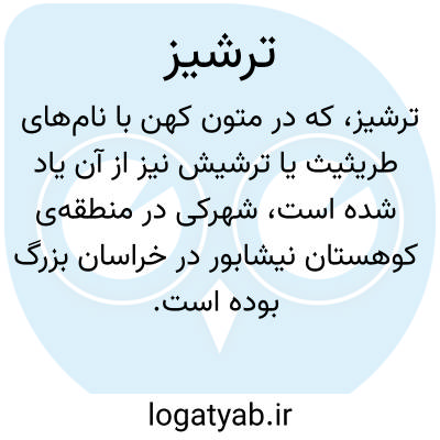 گویند ترشیز از بناهای گشتاسب بن لهراسب است. ( از انجمن آرا ) ( از آنندراج ). ولایت کوچکی از ولایت خراسان و حاکم نشین آنجا موسوم به سلطانیه است. ( ناظم الاطباء ). کاشمر. رجوع به کاشمر و ترشیش و مزدیسنا چ 1 ص 188،340 و مرآت البلدان ج 1 ص 421 و جهانگشای جوینی ج 2 ص 46 و 47 و 70 و 71و لباب الالباب ج 2 ص 49 و التفهیم بیرونی ص 148 و 457 و مجمل التواریخ ص 109 و ایران باستان ج 3 ص 2186 و تاریخ سیستان ص 154، 234، 292، 407 و مجالس النفائس ص 17، 64، 67، 80، 98، 204، 237 و نزهةالقلوب ص 143، 146، 178 و تاریخ گزیده ص 518 و تذکرةالملوک ص 80 و حبیب السیر و سبک شناسی بهار و تاریخ مغول و تاریخ ادبیات برون و تاریخ عصر حافظ، و طریثیث در همین لغت نامه شود.