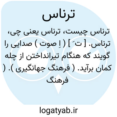 ترناس. [ ت َ ] ( اِ صوت ) صدایی را گویند که هنگام تیرانداختن از چله کمان برآید. ( فرهنگ جهانگیری ). ( فرهنگ رشیدی ). صدا و آوازی باشد که بوقت تیرانداختن از چله کمان برآید. ( برهان ) ( ناظم الاطباء ). صدای انداختن تیر ازچله کمان را گویند. ( انجمن آرا ) ( آنندراج ). اما درشعر فردوسی و اسدی که شاهد آورده اند سرپاس دیده شده به معنی گرز و اﷲ اعلم. ( فرهنگ رشیدی ):