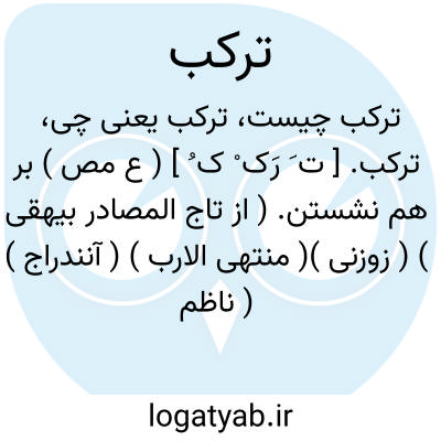 ترکب. [ ت َ رَک ْ ک ُ ] ( ع مص ) بر هم نشستن. ( از تاج المصادر بیهقی ) ( زوزنی )( منتهی الارب ) ( آنندراج ) ( ناظم الاطباء ). مطاوعه ترکیب. ( اقرب الموارد ) ( المنجد ): چو فراشی و کناسی است، که هر امتزاجی که میان اجزاء امهات افتد بر آن قدر کز آن امتزاج آید، چیزی بسازد نباتی یا حیوانی، بدان مرین سرای را پاک همی دارد و طینتها را ازبهر آنک تا ازو ترکب مردم آید. ( جامع الحکمتین ناصرخسرو ص 130 ). || استوار شدن بر چیزی. ( از تاج المصادر بیهقی ) ( زوزنی ). استوار گردیدن. ( منتهی الارب ) ( آنندراج ) ( ناظم الاطباء ). رجوع به ترکیب شود.