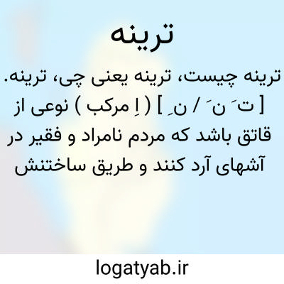 ترینه. [ ت َ ن َ / ن ِ ] ( اِ مرکب ) نوعی از قاتق باشد که مردم نامراد و فقیر در آشهای آرد کنند و طریق ساختنش آن است که نان نیم پخته را ریزه ریزه کرده با فلفل و زیره و سیاه دانه، نیم کوفته، و سبزیهای ریزه کرده مانند شلغم و چغندر و گندنا و پودینه و امثال آن، مجموع را در تغاری کنند و سرکه و دوشاب بر بالای آن ریزندو مشت بسیاری بزنند تا خوب خمیر شود، و در آفتاب نهند، و همچنین تا چهل روز بدین دستور هر روز سرکه و دوشاب بر آن ریزند و بر هم زنند و در آفتاب نهند تا بقوام آید، و بعد از چهل روز قرصها از آن سازند و خشک کنند و در وقت احتیاج قرصی از آن در آب گرم اندازندتا نرم شود، قاتق آش کنند. ( برهان ) ( از فرهنگ جهانگیری ) ( از فرهنگ رشیدی ) ( از انجمن آرا ) ( از آنندراج ).نوعی از قاتق که مردم نامراد و درویش در آشها کنند.( ناظم الاطباء ). مخفف تربا بود. ( فرهنگ خطی کتابخانه سازمان لغتنامه ). صاحب آنندراج در ذیل ترخوانه آرد:... و آنرا بحذف خا، ترینه نیز گویند: