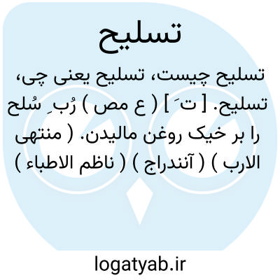 تسلیح. [ ت َ ] ( ع مص ) رُب ِ سُلح را بر خیک روغن مالیدن. ( منتهی الارب ) ( آنندراج ) ( ناظم الاطباء ) ( از اقرب الموارد ) ( از متن اللغة ). || شمشیر را سلاح کسی گردانیدن. ( منتهی الارب ) ( از آنندراج ) ( ناظم الاطباء ) ( از اقرب الموارد ) ( از المنجد ) ( از متن اللغة ). || سلاح پوشانیدن کسی را. ( از المنجد ). || به ریخ زدن انداختن گیاه تر، شتر را. ( از متن اللغة ). به ریستن واداشتن شتر یا حیوان دیگر را. ( از متن اللغة ) ( از المنجد ).