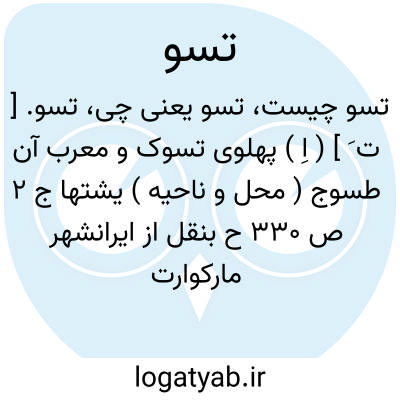 تسو. [ ت َ ] ( اِ ) پهلوی تسوک و معرب آن طسوج ( محل و ناحیه ) یشتها ج 2 ص 330 ح بنقل از ایرانشهر مارکوارت ص 74 ( حاشیه برهان چ معین ). رجوع به تسوک شود. || مقدار و وزن چهار جو باشد. ( برهان ) ( ناظم الاطباء ) ( از شرفنامه منیری ). || قیراط. ( مهذب الاسماء ). یک حصه از بیست و چهار حصه شبانه روز که عبارت از یک ساعت باشد و یک حصه از بیست و چهار حصه چوب گز استادان خیاط و همچنین یک حصه از بیست و چهار حصه سیر استادان بقال و معرب آن طسوج است. ( برهان ) ( از ناظم الاطباء ). حصه ای از بیست و چهار حصه گز باشد. و سیر و روز و شب و غیره را نامند. و مثلا از بیست و چهار حصه گز یک حصه تسو باشد و سیر را که بیست و چهار توله است یک توله را تسو گویند و معرب آن طسوج باشد. ( جهانگیری ) ( از انجمن آرا ) ( از آنندراج ). ربع دانگ. طسوج به فتح و تشدید سین معرب آن و در فرهنگ حصه ای از بیست و چهار حصه گز و سیر و روز و شب. مثلا از بیست و چهار حصه گز یک حصه تسو باشد و از بیست و چهار توله سیر یک توله و از بیست و چهار ساعت از شب و روز یک ساعت. اما این معانی در فرس دیده نشده. ( فرهنگ رشیدی ). رشیدی گفته این معانی که صاحب جهانگیری نوشته در فرس دیده نشده و مستعمل هند است و حق با اوست. ( انجمن آرا ) ( آنندراج ). یک بیست و چهارم حصه هر چیز. ( غیاث اللغات ):... از مقدار یک درم که زمین است پنج دانگ و سه تسو گفته اند اهل کفر و شرک و بدعت و ضلالت اند. ( کتاب النقض ص 492 ). از أقصی بلاد روم و فرنج و... تا سد یأجوح و مأجوج و... سومنات یک تسو مسلمان است. ( کتاب النقض ص 492 ).
