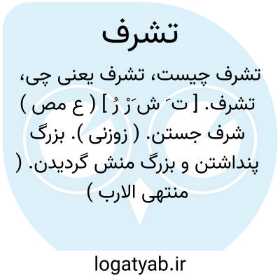 تشرف. [ ت َ ش َرْ رُ ] ( ع مص ) شرف جستن. ( زوزنی ). بزرگ پنداشتن و بزرگ منش گردیدن. ( منتهی الارب ) ( آنندراج ) ( ناظم الاطباء ). || دارای شرف شدن خانه. || شرف یافتن کسی از غیر خود. ( از اقرب الموارد ). || شرف دانستن، یقال: تشرف بکذا؛ ای عده شرفاً. ( منتهی الارب ) ( ناظم الاطباء ) ( ازآنندراج ) ( از اقرب الموارد ). || کشته شدن اشراف قوم. ( منتهی الارب ) ( آنندراج ) ( ناظم الاطباء ). || دست را بالای ابرو قرار دادن تا بتواند چیزی را ببیند و نیک تشخیص دهد. ( از اقرب الموارد ). || بالا برآمدن چیزی را. ( منتهی الارب ) ( آنندراج ) ( ناظم الاطباء ): تشرف للشی ٔ؛ تطلع الیه. ( اقرب الموارد ). || بسوی چیزی نگریستن و چشم آن داشتن و از این معنی است حدیث لاتشرفوا البلاء؛ ای لاتطلعوا الیه. ( منتهی الارب ) ( آنندراج ) ( ناظم الاطباء ).