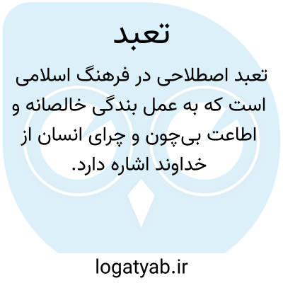 ۱ -( مصدر ) عبادت کردن بندگی ورزیدن پرستش کردن. ۲ - چیزی را بی چون و چرا پذیرفتن. ۳ -( اسم ) بندگی پرستش. جمع: تعبدات.