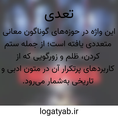 ۱ - ( مصدر ) تجاوز کردن ز انداز. خود گذشتن. ۲ - ستم کردن دست اندازی کردن. ۳ - ( اسم ) دست اندازی. ۴ - ستمکاری. ۵ - سر زدن فعل از فاعل و بمفعول رسیدن. جمع: تعدیات.