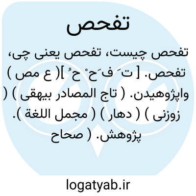تفحص. [ ت َ ف َح ْ ح ُ ]( ع مص ) واپژوهیدن. ( تاج المصادر بیهقی ) ( زوزنی ) ( دهار ) ( مجمل اللغة ). پژوهش. ( صحاح الفرس ). بازکاویدن. ( منتهی الارب ) ( آنندراج ) ( ناظم الاطباء ). کاویدن. ( غیاث اللغات ). وارسی و جستجو کردن. ( از اقرب الموارد ): و تفحص احوال و عادات و اخلاق خویش را بدو مفوض کند. ( تاریخ بیهقی چ ادیب ص 99 ). و تفحص کردند جمله خردمندان مملکت را. ( تاریخ بیهقی ایضاً ص 102 ). شیر... روی به تفحص حال... او آورد. ( کلیه و دمنه ).