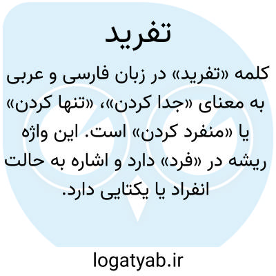 کلمه «تفرید» در زبان فارسی و عربی به معنای «جدا کردن»، «تنها کردن» یا «منفرد کردن» است. این واژه ریشه در «فرد» دارد و اشاره به حالت انفراد یا یکتایی دارد، یعنی چیزی که از دیگران متمایز یا جدا شده باشد.