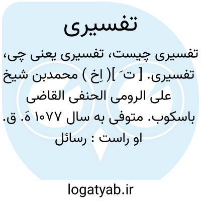 تفسیری. [ ت َ ]( اِخ ) محمدبن شیخ علی الرومی الحنفی القاضی باسکوب. متوفی به سال 1077 هَ. ق. او راست: رسائل علی انوارالتنزیل للبیضاوی. ( از اسماء المؤلفین ج 2 ص 291 ).