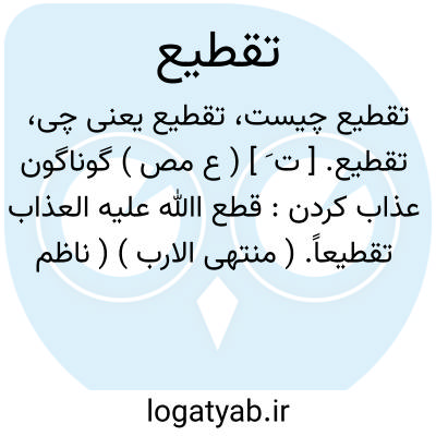 تقطیع. [ ت َ ] ( ع مص ) گوناگون عذاب کردن: قطع اﷲ علیه العذاب تقطیعاً. ( منتهی الارب ) ( ناظم الاطباء ) ( از اقرب الموارد ). || آبرا آمیختن در شراب. ( منتهی الارب ) ( ناظم الاطباء ) ( ازآنندراج ) ( از اقرب الموارد ). || اسب از پیش اسبان بشدن. ( تاج المصادر بیهقی ). درگذشتن اسب ازاسبان دیگر. ( منتهی الارب ) ( آنندراج ). || پاره پاره کردن. ( تاج المصادر بیهقی ) ( زوزنی ) ( دهار ) ( ترجمان جرجانی ترتیب عادل بن علی ) ( منتهی الارب ) ( آنندراج ) ( ناظم الاطباء ). قطعشدگی و قطعه قطعه. ( ناظم الاطباء ). || ( اصطلاح عروض ) سنجیدن شعر به اجزای عروض. ( منتهی الارب ) ( از ناظم الاطباء ). تحلیل شعر به اجزای عروضی آن. ( از اقرب الموارد ). به اصطلاح عروضیان تجزیه کردن الفاظ بر اوزان افاعیل بحور. ( آنندراج ).... بدان که تقطیع شعر آن است که بیت را از هم فروگشایند و بر اسباب و اوتاد و فواصل قسمت کنند تا هر جزوی در وزن برابر جزوی شود از افاعیل بحری که این بیت از آن منبعث باشد چنانکه اسباب این در مقابل اسباب آن افتد و اوتاد در مقابل اوتاد و فواصل در مقابل فواصل. و در این باب اعتبار ملفوظ شعر را باشد نه مکتوب آنرا، اعنی هر حرف که در لفظ نیاید اگرچه در کتابت باشد در تقطیع آنرا اعتباری ننهند و هرچه در لفظ آید اگرچه در کتابت نباشد در تقطیع بحرفی محسوب بود، چون الف آهن و آهو و آتش و آسمان و مانند آن که در این کلمات اگرچه یک الف بیش ننویسند چون بحکم اشباع همزه الفی در لفظ ظاهر میشود آنرا بحرفی ساکن محسوب دارند و همچنین تشدید بحرفی محسوب باشد چنانکه: