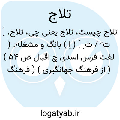 تلاج. [ ت َ / ت ِ ] ( اِ ) بانگ و مشغله. ( لغت فرس اسدی چ اقبال ص 54 ) ( از فرهنگ جهانگیری ) ( فرهنگ رشیدی ) ( برهان ) ( اوبهی ) ( انجمن آرا ) ( آنندراج ) ( از ناظم الاطباء ). شور و غوغا و غلغله. ( برهان ) ( از غیاث اللغات )( از شرفنامه منیری ) ( از ناظم الاطباء ):