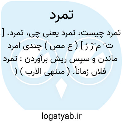 تمرد. [ ت َ م َرْ رُ ] ( ع مص ) چندی امرد ماندن و سپس ریش برآوردن: تمرد فلان زماناً. ( منتهی الارب ) ( آنندراج ) ( ناظم الاطباء ) ( از اقرب الموارد ). مدتی بی ریش بماندن، پس ریش برآوردن. ( تاج المصادر بیهقی ). || شوخ و ستنبه شدن. ( تاج المصادر بیهقی ) ( زوزنی ). ستنبه شدن. ( دستور اللغة ) ( مجمل اللغة ).سرکشی کردن. ( غیاث اللغات ). سرکشی کردن و رسیدن در نافرمانی بجایی که از نوع خود بیرون رود. ( آنندراج ).متنبه و سرکش شدن. ( منتهی الارب ) ( آنندراج ) ( ناظم الاطباء ). عصیان کردن و از حد خود تجاوز نمودن چنانکه پند و نصیحتی را نپذیرد. ( از اقرب الموارد ). گردن کشی کردن. ( دهار ) سرکشی و گردنکشی و خودسری و مخالفت و نافرمانی و بتره و عدم اطاعت و عدم انقیاد و تحقیر حکم و فرمان، و طغیان. ( ناظم الاطباء ): نه در ضمیر ضعیفان آزاری صورت بندد و نه گردنکشان را مجال تمرد باقی ماند. ( کلیله و دمنه ). تا معاندت فجار و تمرد کفار ظاهر گشت. ( کلیله و دمنه ). دشمن که... تمرد او به تودد زیادت گردد از او نجات نتوان یافت مگر به هجر. ( کلیله و دمنه ). از عقوق و تمرد پسر مستغاث شد و از حرکات و سکنات اوتبرا نمود. ( ترجمه تاریخ یمینی چ 1 تهران ص 343 ).
