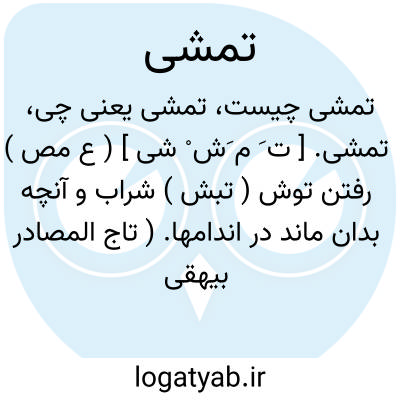 تمشی. [ ت َ م َش ْ شی ] ( ع مص ) رفتن توش ( تبش ) شراب و آنچه بدان ماند در اندامها. ( تاج المصادر بیهقی ). برفتن تپش شراب و مانند آن در اندامها، یقال: تمشت فیه حمیاالکأس؛ ای ذهبت و جرت. ( منتهی الارب ) ( ناظم الاطباء ) ( از اقرب الموارد ).