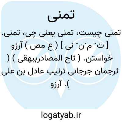 تمنی. [ ت َ م َن ْ نی ] ( ع مص ) آرزو خواستن. ( تاج المصادربیهقی ) ( ترجمان جرجانی ترتیب عادل بن علی ). آرزو کردن. ( مجمل اللغة ) ( غیاث اللغات ). حصول چیزی را طلب کردن. ( از اقرب الموارد ). آرزو بردن. ( دهار ) ( منتهی الارب ) ( آنندراج ) ( ناظم الاطباء ). تمنا و استدعا و درخواست و التماس. ( ناظم الاطباء ). طلب حصول چیزی بدون توجه به ممکن یا ممتنع بودن آن. ( از تعریفات جرجانی ). رجوع به کشاف اصطلاحات الفنون و مطول شود: