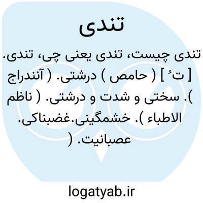 تندی. [ ت ُ ] ( حامص ) درشتی. ( آنندراج ). سختی و شدت و درشتی. ( ناظم الاطباء ). خشمگینی.غضبناکی. عصبانیت. ( فرهنگ فارسی معین ):