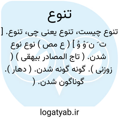 تنوع. [ ت َ ن َوْ وُ ] ( ع مص ) نوع نوع شدن. ( تاج المصادر بیهقی ) ( زوزنی ). گونه گونه شدن. ( دهار ). گوناگون شدن. ( منتهی الارب ) ( آنندراج ) ( غیاث اللغات ) ( ناظم الاطباء ) ( از اقرب الموارد ). قسم قسم شدن. ( غیاث اللغات ) ( آنندراج ). گوناگونی و نوع نوع شدگی. ( ناظم الاطباء ). || جنبیدن شاخ. || پیش شدن در رفتن و جز آن، یقال: تنوع فی السیر؛ ای تقدم. ( منتهی الارب ) ( ناظم الاطباء ) ( از اقرب الموارد ).
