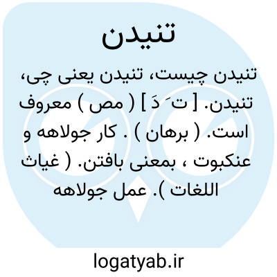 تنیدن. [ ت َ دَ ] ( مص ) معروف است. ( برهان ). کار جولاهه و عنکبوت، بمعنی بافتن. ( غیاث اللغات ). عمل جولاهه و عنکبوت. ( آنندراج ). بافتن و نسج کردن. ( حاشیه برهان چ معین ) ( ناظم الاطباء ). بافتن چنانکه جولایا عنکبوت. ( یادداشت بخط مرحوم دهخدا ):