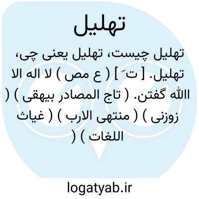 زتسبیح و تهلیل و ما را ز جوع.سعدی ( بوستان ).- اهل تهلیل؛ آنانکه خدای را یگانه دانند و به یکتایی او ایمان دارند: مسلمین هرگز بر هیچکس از اهل تهلیل که قصد او نکردند شمشیر نکشند. ( تاریخ سیستان ).
