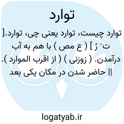 ۱- ( مصدر ) پیاپی وارد شدن پشت سرهم داخل شدن.۲ - در یک وقت وارد شدن با هم فردو آمدن. ۳ - شعر سرودن دو شاعر بدون اطلاع از یکیدگر بطوریکه شعرشان لفظا و معنا ( با یکی از این دو ) عین هم یا مانند یکدیگر باشد موارده. جمع: تواردات.