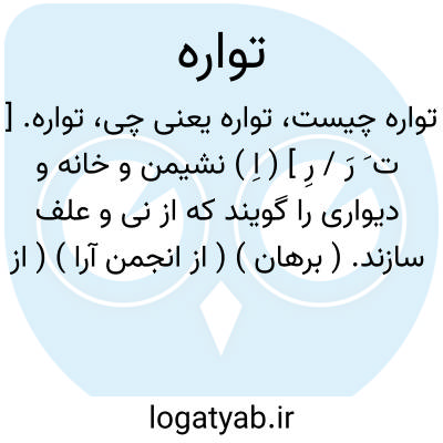 تواره. [ ت َ رَ / رِ ] ( اِ ) نشیمن و خانه و دیواری را گویند که از نی و علف سازند. ( برهان ) ( از انجمن آرا ) ( از آنندراج ) ( از فرهنگ جهانگیری ) ( از فرهنگ رشیدی ). خانه ای که از نی و علف سازند و در آن مستحفظین باغ انگور پناهنده شوند. ( ناظم الاطباء ):