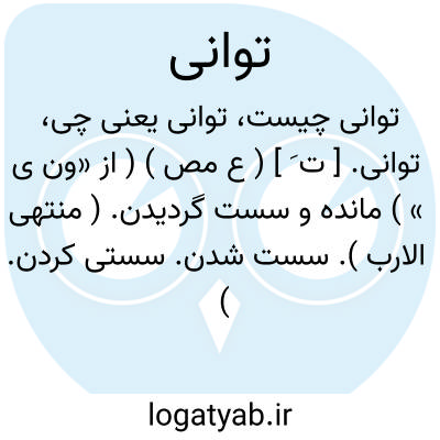 توانی. [ ت َ ] ( ع مص ) ( از «ون ی » ) مانده و سست گردیدن. ( منتهی الارب ). سست شدن. سستی کردن. ( فرهنگ فارسی معین ). مبادرت کردن در ضبط کاری و سستی کردن: توانی فی الامر؛ مبادرت نکرد در ضبط آن کار و سستی نمود. ( ناظم الاطباء ).سستی کردن. ( غیاث اللغات ) ( آنندراج ). || کوتاهی کردن، یقال: توانی فی حاجته؛ ای قصر فیها. ( منتهی الارب ) ( ناظم الاطباء ). تقصیر کردن. ( غیاث اللغات ) ( آنندراج ) ( از اقرب الموارد ). || ( اِمص )سستی و کوتاهی. ( فرهنگ فارسی معین ). سستی. کوتاهی. قصور. فتور. ( یادداشت بخط مرحوم دهخدا ):