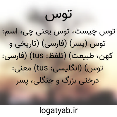 معنی: درختی بزرگ و جنگلی، پسر نوذر پهلوان و سردار بزرگ ایران در دوره ی کیقباد، غان، کیکاووس و کیخسرو، سردار لشکر ایران در جنگهای میان ایران و توران، ) توس ( = طوس ) نام قدیم ناحیه ای در شمال خراسان، کمابیش معادل شهرستان مشهد کنونی، که شهرهای مهمش تابران، نوقان و رادکان بود، ) نام جایی ( روستایی ) در بخش مرکزی شهرستان مشهد، آرامگاه فردوسی شاعر ایرانی، سراینده ی شاهکار بزرگ شاهنامه، در آنجا واقع است، ( در اعلام ) ( = طوس )، پسر نوذر پهلوان و سردار بزرگ ایران در دوره ی کیقباد و کیکاووس و کیخسرو، طوس، از شخصیتهای شاهنامه، نام شاهزاده و پهلوان ایرانی ملقب به زرینه کفش، فرزند نوذر پادشاه پیشدادی