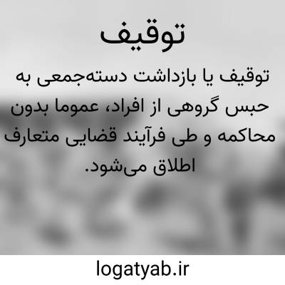 توقیف. [ ت َ ] ( ع مص ) ایستانیدن. ( منتهی الارب ) ( آنندراج ) ( ناظم الاطباء ) ( از اقرب الموارد ). || دست آورنجن در دست کسی کردن. ( تاج المصادر بیهقی ). دست برنجن بر دست کردن. || به حنا خجک زدن در دست. || پی خون آلود بر خانه کمان پیچیدن. ( منتهی الارب ) ( آنندراج ) ( ناظم الاطباء ) ( از اقرب الموارد ). || وقف گردانیدن اسب را. ( منتهی الارب ) ( آنندراج ) ( ناظم الاطباء ). || ساختن وقف برای سپر. ( از اقرب الموارد ). رجوع به وقف شود. || اصلاح کردن زین را و ساختن زین را بطوری که پشت ریش نکند. || بیان کردن حدیث را. ( منتهی الارب ) ( آنندراج ) ( ناظم الاطباء ) ( اقرب الموارد ). || واقف گردانیدن. ( تاج المصادر بیهقی ) ( زوزنی ). واقف گردانیدن کسی را بر چیزی و نص کردن. ( منتهی الارب ) ( آنندراج ) ( ناظم الاطباء ). || وقوف آوردن در حج در پس یکدیگر. ( منتهی الارب ) ( آنندراج ) ( ناظم الاطباء ) ( از اقرب الموارد ). || به موقف ایستادن. ( تاج المصادر بیهقی ). || ایستادن لشکریان. ( منتهی الارب ) ( آنندراج ) ( ناظم الاطباء ). ایستادن لشکریان یکی بعد دیگری. ( از اقرب الموارد ). || جای دست برنجن بریدن. ( منتهی الارب ) ( آنندراج ) ( ناظم الاطباء ). || تعلیم قاری مواضع وقف را. ( از اقرب الموارد ). || ( اِ ) نشانی است در تیر قمار. ( منتهی الارب )( آنندراج ) ( ناظم الاطباء ). || حکم به بازداشتن و نگاه داشتن و ضبط کردن. ( ناظم الاطباء ). بازداشت. بازداشتن. ( یادداشت بخط مرحوم دهخدا ). فرهنگستان ایران «بازداشته » را به جای توقیفی و توقیف شده پذیرفته است. رجوع به واژه های نو فرهنگستان ایران شود.