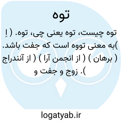 توه. ( اِ )به معنی تووه است که جفت باشد. ( برهان ) ( از انجمن آرا ) ( از آنندراج ). زوج و جفت و دوتائی. ( ناظم الاطباء ). || به معنی لای و ته و پرده هم آمده است چنانکه هرگاه گویند توه بر توه، از آن لای بر لای و ته بر ته و پرده بر پرده مراد باشد. ( برهان ) ( از ناظم الاطباء ). لای و ته و پرده. ( انجمن آرا ) ( آنندراج ).