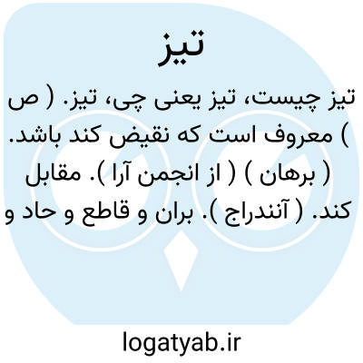 تیز. ( ص ) معروف است که نقیض کند باشد. ( برهان ) ( از انجمن آرا ). مقابل کند. ( آنندراج ). بران و قاطع و حاد و برنده. ( از ناظم الاطباء ). بران. برنده. تند. قاطع.سخت برنده. مقابل کند. ( از یادداشت بخط مرحوم دهخدا ). پارسی باستان «تیگرا خئودا» ( دارنده خود نوک تیز ) اوستا «بروئیثرو تئه ژا» ( با لبه تیز ) پهلوی «تیج » پازند «تیژ» نیز در پهلوی «تیش » به معنی تبر. هندی باستانی «تیج »، «تجتی » ( تیز کردن تیز بودن ). کردی «تیژ» بلوچی دخیل «تیز» افغانی دخیل «تیز»، «تیزل » سریکلی «ته ایز» وخی «تیز» مازندرانی و گیلکی «تیج » در پارسی تیج ( تبر ) و تیشه ( تبر )... اشکاشمی «تیز» وخی «تاغد» یودغا «تورغه »... طبری «تج » تند. تیز... ( حاشیه برهان چ معین ):