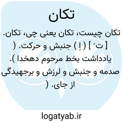 تکان. [ ت َ ] ( اِ ) جنبش و حرکت. ( یادداشت بخط مرحوم دهخدا ). صدمه و جنبش و لرزش و برجهیدگی از جای. ( ناظم الاطباء ). || ترس سخت ناگهانی. ترسی که از امر فجائی پیدا شود و دل بلرزاند. ( یادداشت بخط مرحوم دهخدا ). || لرزه. ( یادداشت ایضاً ). رجوع به تکان دادن و تکان خوردن شود.
