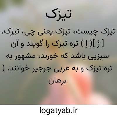 تیزک. [ زَ ]( اِ ) تره تیزک را گویند و آن سبزیی باشد که خورند، مشهور به تره تیزک و به عربی جرجیر خوانند. ( برهان ) ( آنندراج ). گیاهی که جرجیر و تره تیزک نامند. || ( ص ) مصغر تیز؛ یعنی اندکی تیز. ( ناظم الاطباء ).