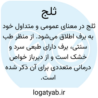 ثلج در معنای عمومی و متداول خود به برف اطلاق میشود. از منظر طب سنتی، برف دارای طبعی سرد و خشک است و از دیرباز خواص درمانی متعددی برای آن ذکر شده است. به عنوان مثال، در تسکین دردهای دندان ناشی از حرارت، کمک به دفع زالوی چسبیده در حلق، و درمانی برای کرم معده و تقویت هضم در افراد با معده گرم، موثر دانسته شده است. همچنین، در کاهش تبهای حاره و بهبود عوارض پوستی نظیر جرب و خارش نیز کاربرد داشته است. ضماد برف بر پیشانی برای قطع خونریزی بینی (رعاف) و ترکیب آن با نمک برای یخ بستن سریع آب در ظروف، از دیگر خواص شگفتانگیز آن به شمار میآید. با این حال، مصرف خوراکی مستقیم برف میتواند منجر به تجمع حرارت در معده، بیحسی، ایجاد تشنگی مفرط، و بروز سرفه شود و برای افرادی با احشاء ضعیف یا کسانی که از اورام باطنی رنج میبرند، مضر است. به همین دلیل، استفاده از آب ناشی از ذوب برف (آب پرورده) یا مصرف آن به همراه مصلحاتی چون قرنفل و عسل، توصیه شده است. جمع مکسر ثلج در این معنا، ثلوج است.