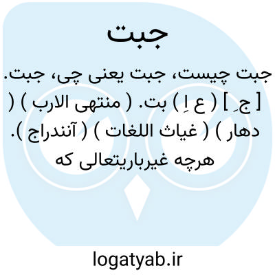 جبت. [ ج ِ ] ( ع اِ ) بت. ( منتهی الارب ) ( دهار ) ( غیاث اللغات ) ( آنندراج ). هرچه غیرباریتعالی که آن را پرستش نمایند. ( منتهی الارب ) ( آنندراج ) ( غیاث اللغات ). آنچه پرستند دون از خدای تعالی. ( السامی فی الاسامی ). آنچه آن را پرستند جز خدای. ( ترجمان علامه جرجانی ). بتی بوده است عرب را. ( یادداشت مؤلف ). طاغوت. صَنَم. نَصب. نُصب. وَثَن. نُصُب. نِدّ: