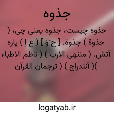 ( جذوة ) جذوة. [ ج َوَ ] ( ع اِ ) پاره آتش. ( منتهی الارب ) ( ناظم الاطباء )( آنندراج ) ( ترجمان القرآن عادل ) ( اقرب الموارد ):...قال َ لاهله امکثوا انّی آنست ُ ناراً لعلّی آتیکم منها بخبر اَو جذوة من النار لعلکم تَصطلون. ( قرآن، 29/28 ). جِذوَة. جُذوة. ( منتهی الارب ) ( ناظم الاطباء ) ( آنندراج ) ( اقرب الموارد ). جمرة. ( قطر المحیط ). || پاره ای از هر چیز. ( منتهی الارب ) ( آنندراج ) ( ناظم الاطباء ). ج، جُذی و جِذی و جِذاء. ( منتهی الارب ) ( آنندراج ). خدرک آتش. ( منتهی الارب ) ( ناظم الاطباء ). خدرک. ( یادداشت مؤلف ). افروخته آتش. ( مهذب الاسماء، نسخه خطی ). ج، جِذی و جُذی ̍ و جِذاء. ( منتهی الارب ) ( آنندراج ). || اخگر سرخ است. ( شرح قاموس ).