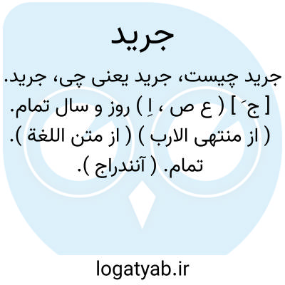 جرید. [ ج َ ] ( ع ص، اِ ) روز و سال تمام. ( از منتهی الارب ) ( از متن اللغة ). تمام. ( آنندراج ). یوم جرید؛ روز تمام و کذلک عام جرید. ( از منتهی الارب ) ( از متن اللغة ). || شاخ درخت خرما. ( آنندراج ). شاخه های درخت خرما و یکی آن جریده است.( از متن اللغة ) ( از اقرب الموارد ) ( از منتهی الارب ). || درختی که شاخ و پوست از آن جدا کرده باشند. ( آنندراج ). جریده. ( یادداشت مؤلف ). || در بیت زیر به معنی یکه رو و تنهاست:
