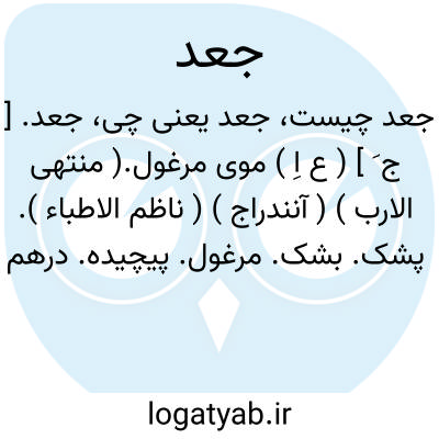 جعد. [ ج َ ] ( ع اِ ) موی مرغول.( منتهی الارب ) ( آنندراج ) ( ناظم الاطباء ). پشک. بشک. مرغول. پیچیده. درهم پیچیده. زره. شکن. شکنج. مجعد. موی پیچیده. موی شکسته. موی مجعد. وژگال، مقابل خوار وفرخال. موی کوتاه، مقابل سبط و مسترسل: