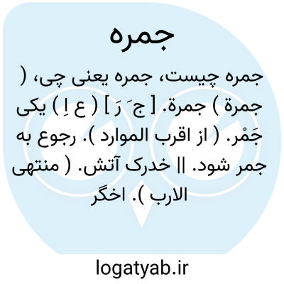 ( اسم ) ۱- اخگر آتش تکه ای آتش. ۲- حرارت و بخاری است که در آخر زمستان در شباط ماه رومی به دفعه از زمین برمیخیزد الف - در هفتم ماه مذکور و زمین بسبب آن گرم میشود و آنرا سقوط جمر. اول میگویند. ب - در چهاردهم و آنرا سقوط جمر. دوم میگویند و بسبب آن آب گرم میگردد. ج - در بیست و یکم که سقوط جمر. سوم باشد اشجار و نباتات گرم شوند. ۳- نزد عرب مراد از سقوط جمره سقوط منازل قمراست چه در هفتم ماه مذکور سقوط جبهه باشد و در چهاردهم سقوط زبره و در بیست و یکم سقوط صرفه و تاثیرات اینها نیز همچنانست که در اول زمین گرم شود و در ثانی آب و در ثالث نباتات. جمع: جمرات.