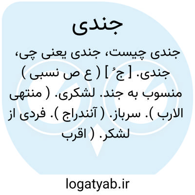 جندی. [ ج ُ ] ( ع ص نسبی ) منسوب به جند. لشکری. ( منتهی الارب ). سرباز. ( آنندراج ). فردی از لشکر. ( اقرب الموارد ). سپاهی. || زنی روسپی که درمیان لشکریان بکار میپرداخت. ( فرهنگ فارسی معین ).
